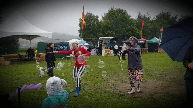 We also made the discovery that bubbles are fine in the rain - so out we went with our Bubblemania station to bring those important bubbles to the hardy and steadfast crowd. An unexpected side effect soon came to our attention as every participant received a soapy wash whilst they played with the bubblemix. Squeaky clean and smiles all round!
